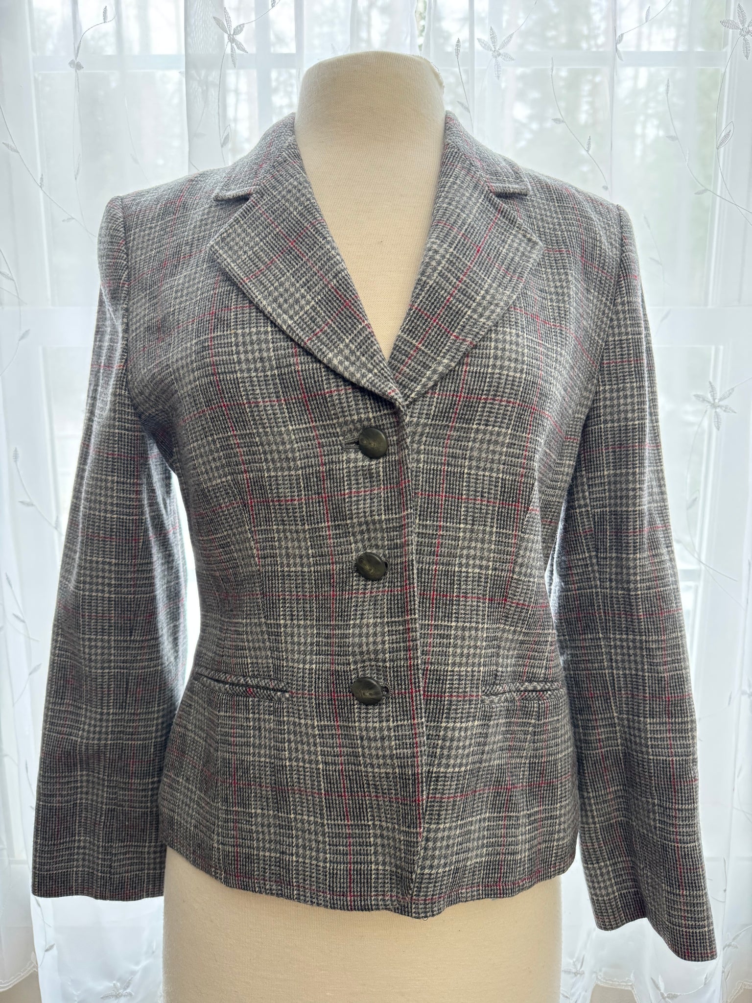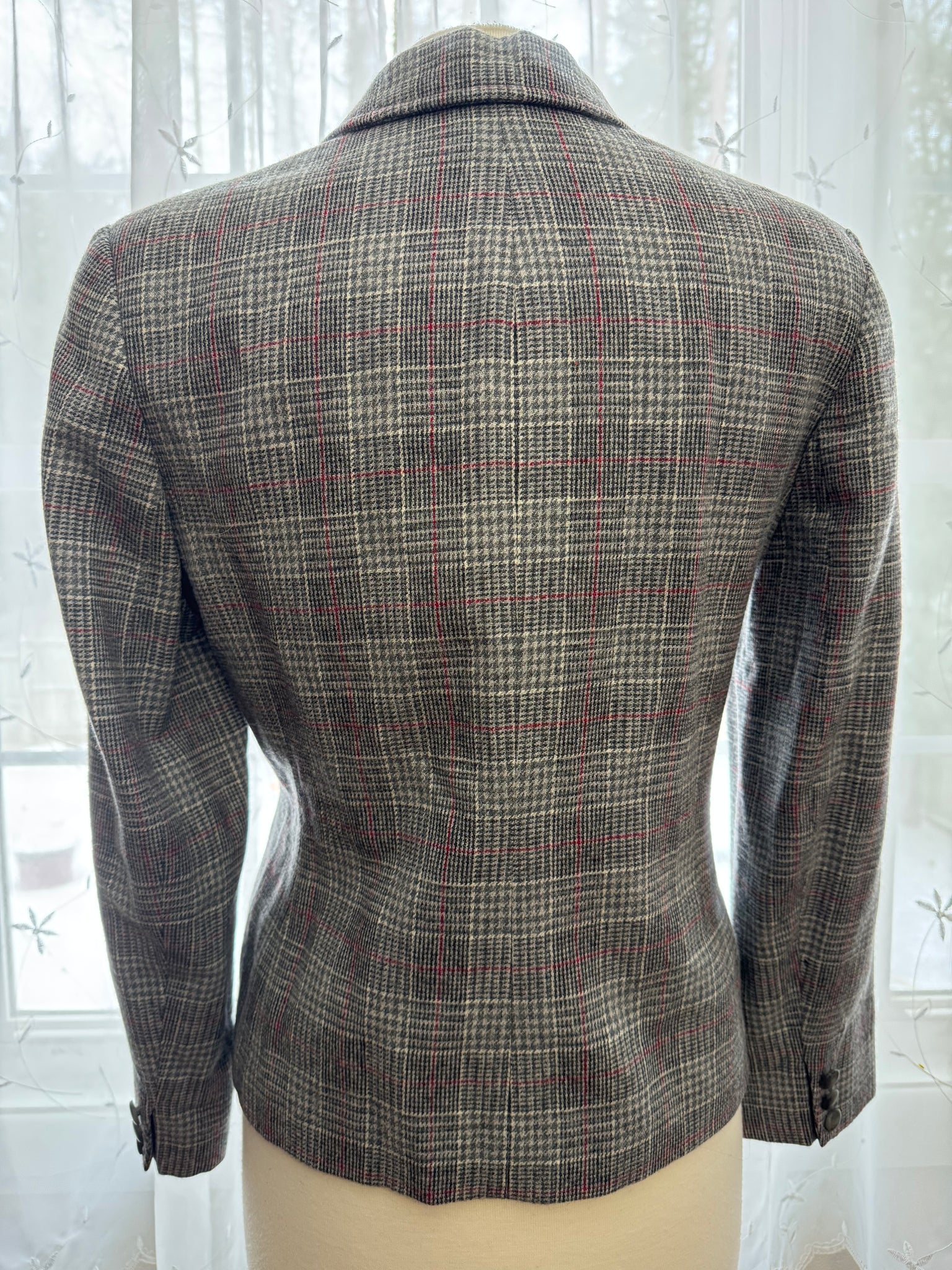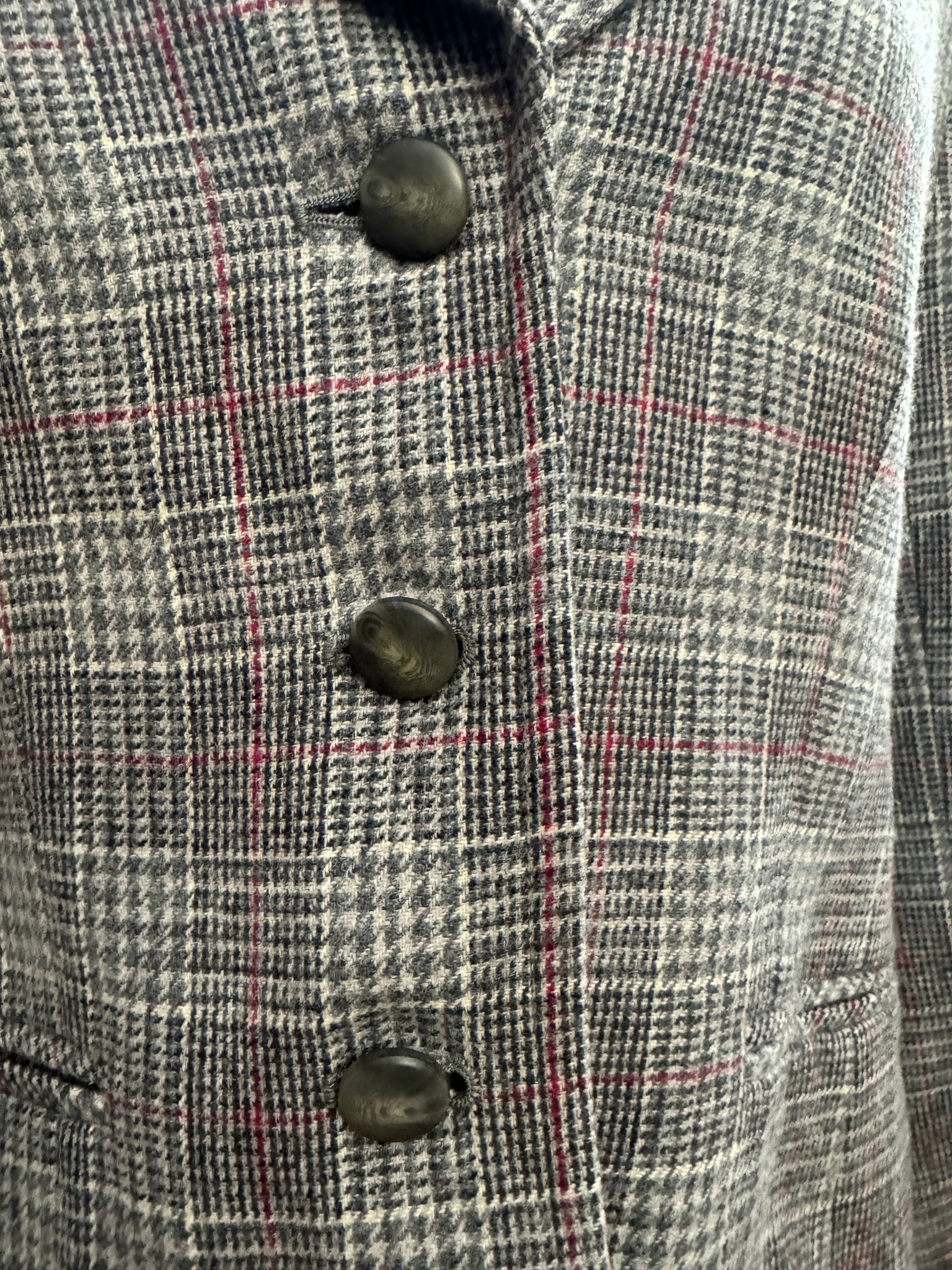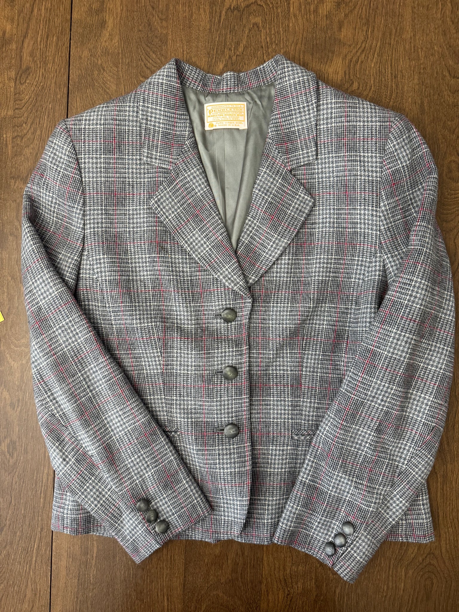 This vintage Pendleton women’s blazer features a timeless gray and white plaid with a subtle red pinstripe running through the design for just the right amount of pop. Classic, tailored, and undeniably well-made, this piece is crafted from 100% pure virgin wool, because made in USA Pendleton doesn’t do shortcuts.